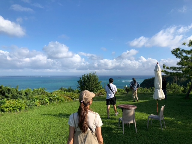 N子*初日にバスに乗り込み外を眺めていたら、道路沿いで藪の中に隠れている御嶽へ背中を震わせて祈る小さいお婆さんの姿がありました。ああ、ついに沖縄に来れたのだと感じると同時に、それはアスムイ御嶽への伏線のようでした。登山口に辿り着くまで、急に眠気に襲われたりと、そこは次元が違う場所。山頂までロープを伝いながら急勾配の山を登り、所々に石が置かれた祈りの場があって、手を合わせながら進みます。かわいい声で鳴く、沖縄独特の蝉の合唱を聞きながら…。やっと辿り着いた、島の最北端から眺める頂上の景色も本当に素晴らしかったです。大切な聖地の為、今後は登ることができなくなるかもしれない場所へ連れて行って下さり感謝しています!三神さん、須田さん、高島さん、ご一緒した皆様、ありがとうございました。アニミズム、信仰、祈り、陽気なイメージの反面、悲しい歴史も背負った沖縄で、人知れず祈り大切なものを守る人々。東京でいつもの生活に戻っても、思いを巡らせています。